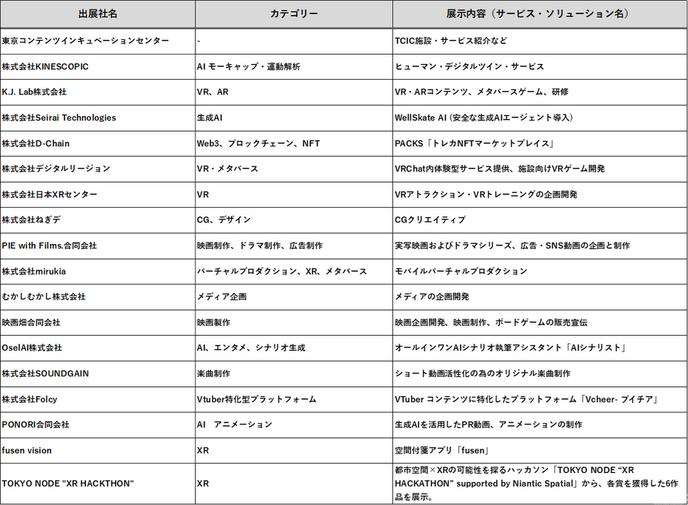 今回展開される「TCICパビリオン」には、TCIC入居企業やコワーキング利用者、支援先企業から17社が集まる。出展企業の領域は、映像制作、Vtuber、マーケティング、Web3、そして産業用VRソリューションまで多岐にわたる。