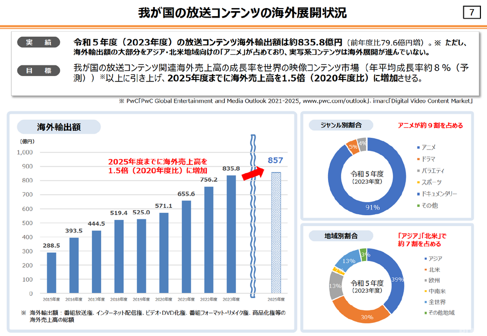 しかし、その輸出構造には偏りがある。令和5年度(2023年度)の放送コンテンツ輸出額は約835.8億円だが、その内訳を見るとアニメが約9割(91%)を占めており、ドラマやバラエティの実写分野は海外展開がほとんど進んでいないのが現状だ。