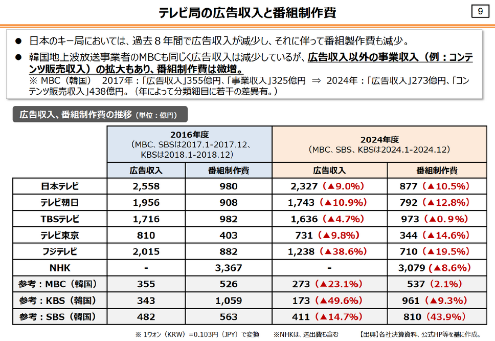 制作環境においても格差が広がっている。韓国の放送局(例:MBC)は、広告収入が減少する中で「コンテンツ販売収入」を伸ばし、番組制作費を維持・微増させている。対して日本のキー局は、広告収入の減少に伴い、番組制作費も削減傾向にある(例:日本テレビは広告収入9.0%減に対し制作費10.5%減)。この「外貨を稼いで制作に回す」サイクルの欠如が、日本の実写コンテンツの大きな課題となっている。