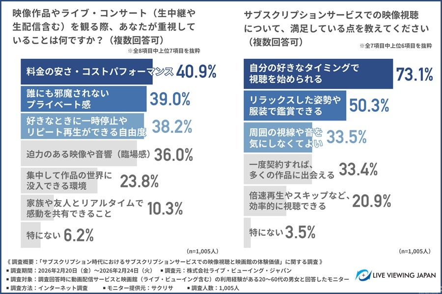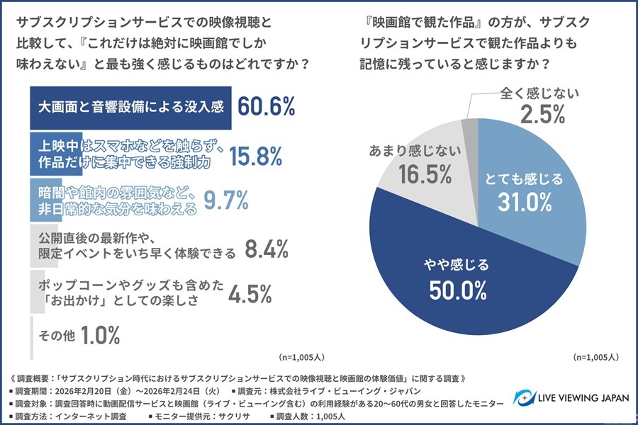 株式会社ライブ・ビューイング・ジャパンは2026年3月13日、「サブスクリプション時代におけるサブスクリプションサービスでの映像視聴と映画館の体験価値」に関する調査結果を発表した。本調査は、動画配信サービスと映画館(ライブ・ビューイング含む)の利用経験がある20~60代の男女1,005人を対象に実施されたもの。
