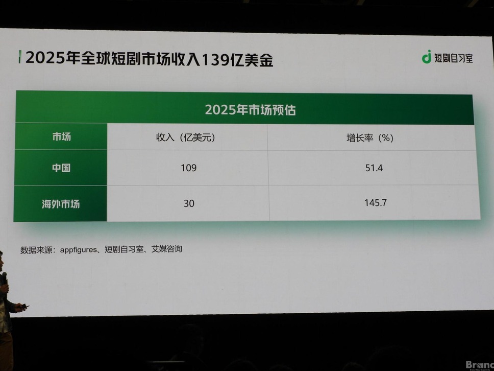短劇自習室(Short Drama Study Room)の運営ディレクター、謝俊金氏が提示したデータによれば、2025年の世界のショートドラマ市場収入は139億ドル(約2兆円)に達する見込みだ。その内訳は、中国市場が109億ドル(成長率51.4%)、海外市場が30億ドル(成長率145.7%)となっている。