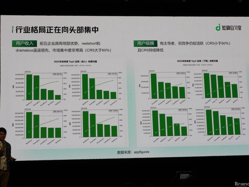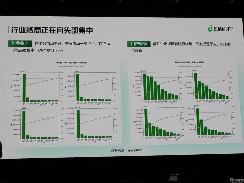 成長鈍化の背景にあるのが、上位アプリによる市場の高度な寡占化だ。ユーザー課金収入において「ReelShort」と「DramaBox」が市場を牽引しており、上位5アプリの市場シェアは全四半期を通して60%を超え、Q4には70.6%にまで達している。国別に見ても、収益面では米国市場が他を圧倒して一極集中する一方、ユーザー規模(ダウンロード数)ではインドが首位を独走するという構造的な偏りがある。