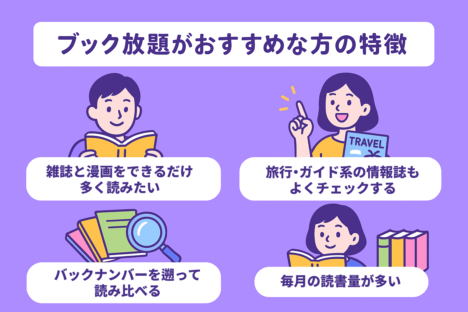 ここまでの比較を踏まえ、ブック放題がどのような方におすすめなのか、具体的な特徴をまとめました。