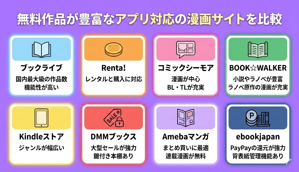 ここでは、アプリの使いやすさと無料作品の多さを両立した主要なサイトを詳しく比較していきます。