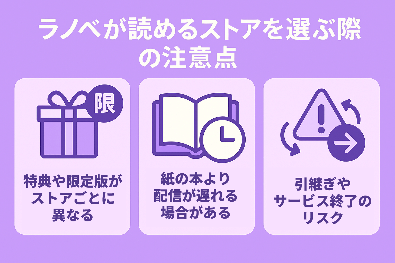 ストアごとの特典の違いや紙の書籍との発売日のズレ、そしてサービス終了のリスクといった点は購入前にしっかりと理解しておくことが大切です。