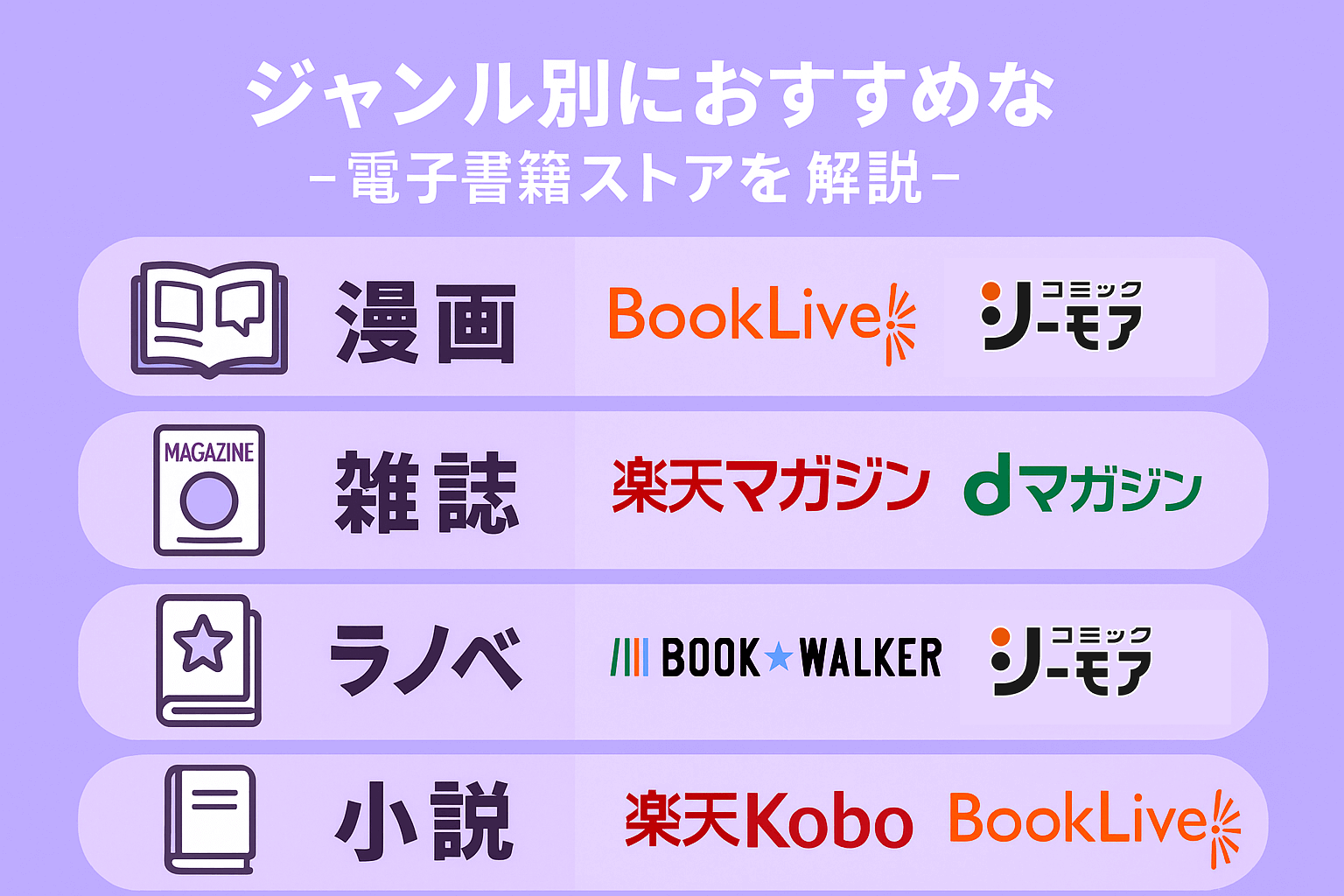 電子書籍ストアは、それぞれ品揃えの傾向や得意なジャンルが異なります。