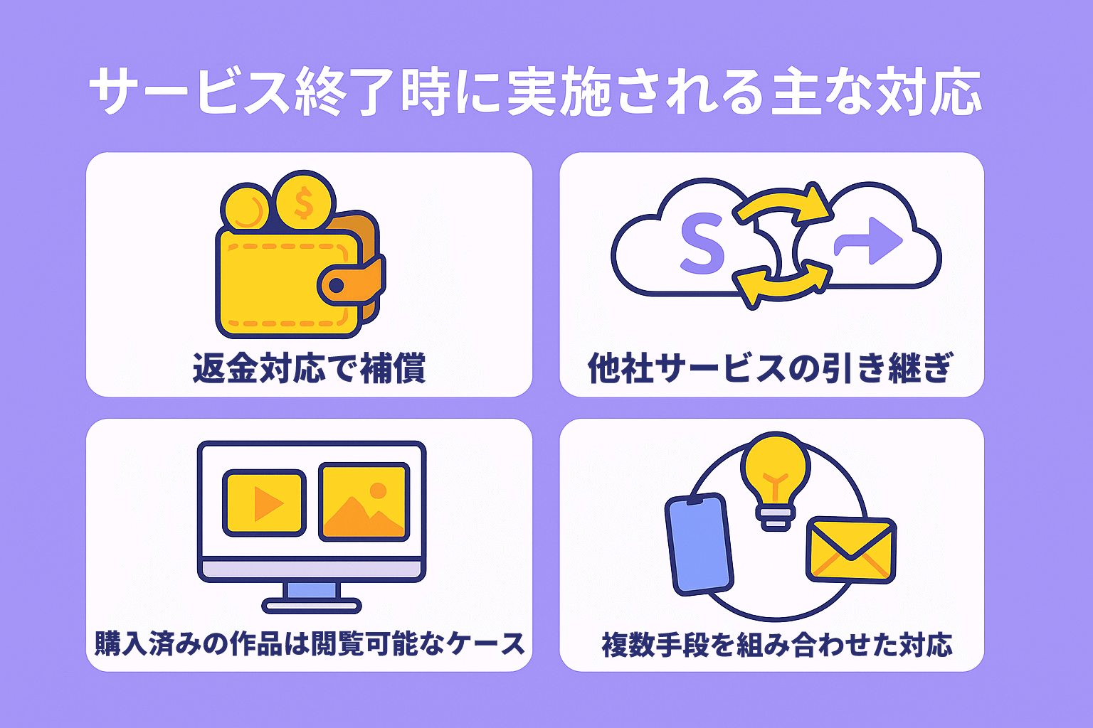 未使用ポイントは返金しつつ、購入済みの作品については他社サービスへ引き継ぐといったように、複数の手段を組み合わせて対応する事例もあります。