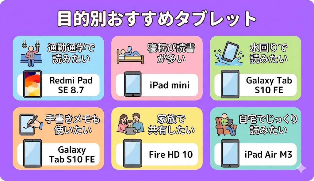 電子書籍をタブレットで読むなら、作品のジャンルや目的に適した端末を選ぶのがおすすめです。