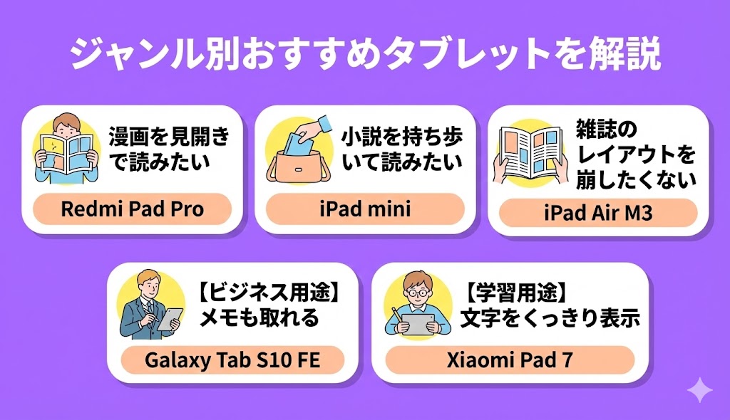 ここでは、主要なジャンルごとに最適なタブレットの選び方と具体的なモデルを提案します。
