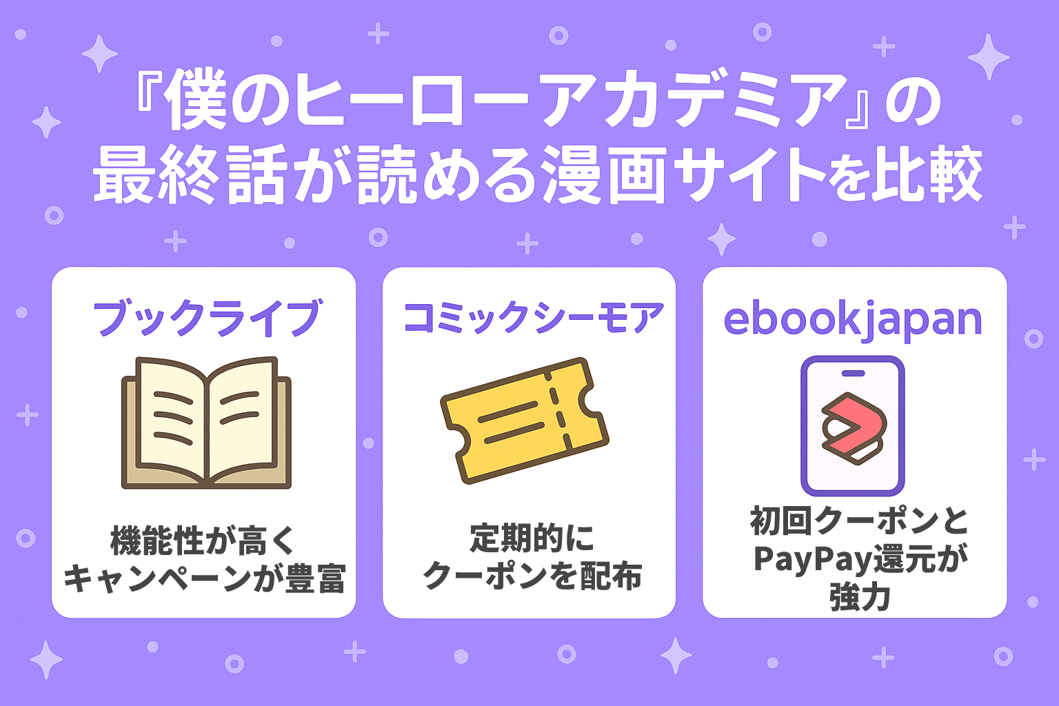 僕のヒーローアカデミアの最終話は、本記事で紹介したブックライブやコミックシーモア、ebookjapanなどの主要な漫画サイトであれば、すべて読むことができます。