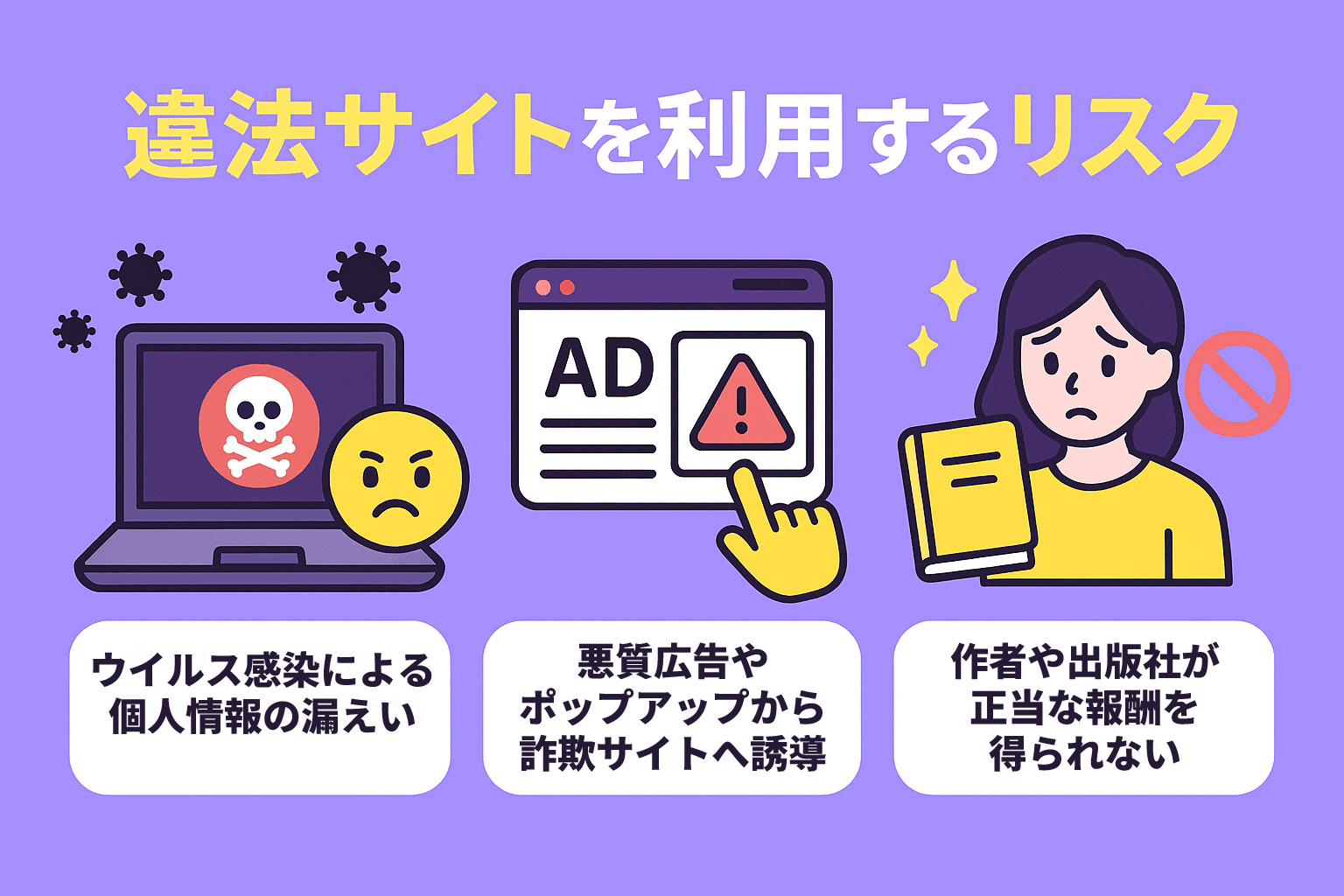 また、漫画バンクなどの違法サイトには法的リスクやウイルス感染、個人情報漏えいなどの危険性があるため、絶対に利用してはいけません。
