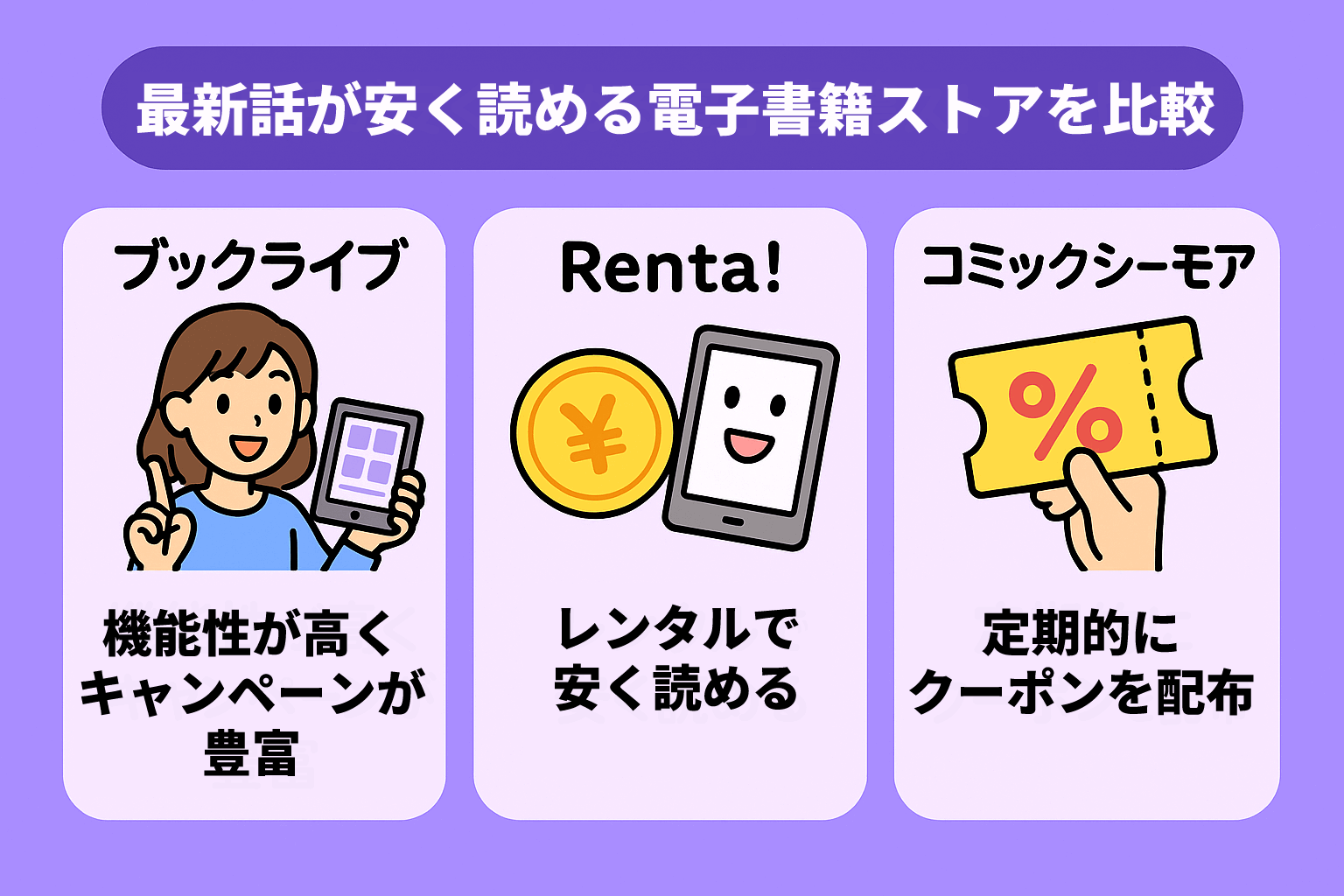一方で、特定の作品の最新話だけを読みたい方や、読む量が月によってバラバラな方は、ブックライブやRenta!のような都度購入型のストアの方が安くすむ場合があります。