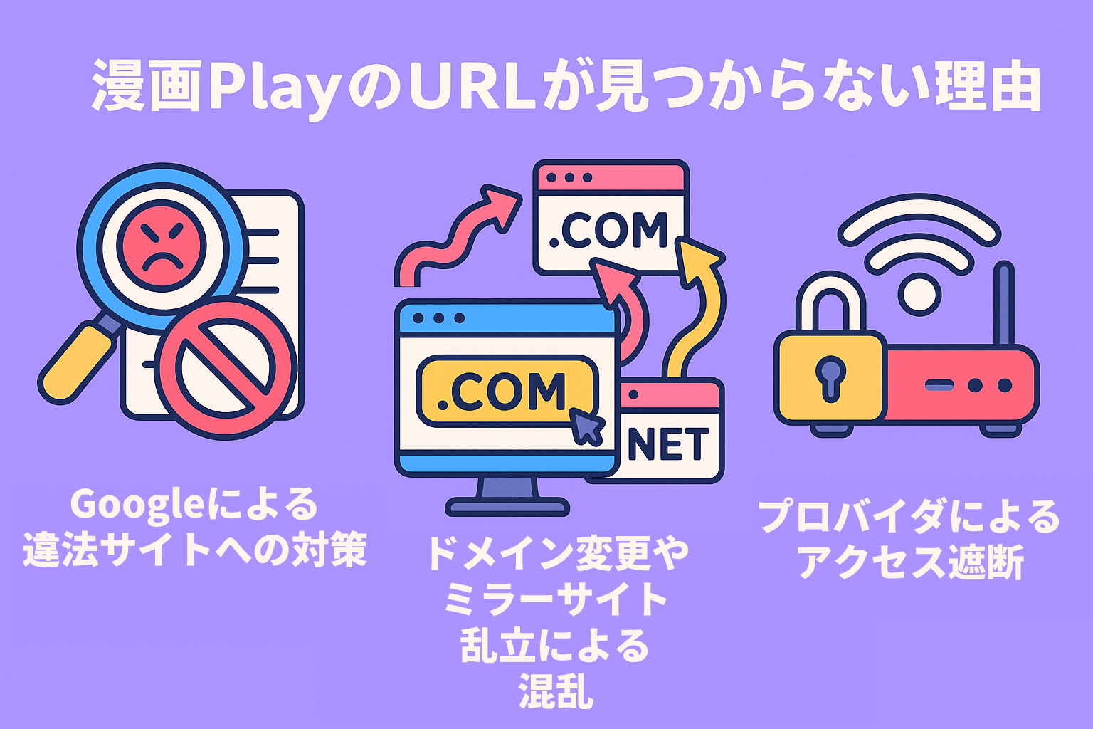 漫画PlayのURLが見つからないのは、閉鎖と復旧を繰り返したり、アクセスがブロックされている可能性が高いと考えられます。