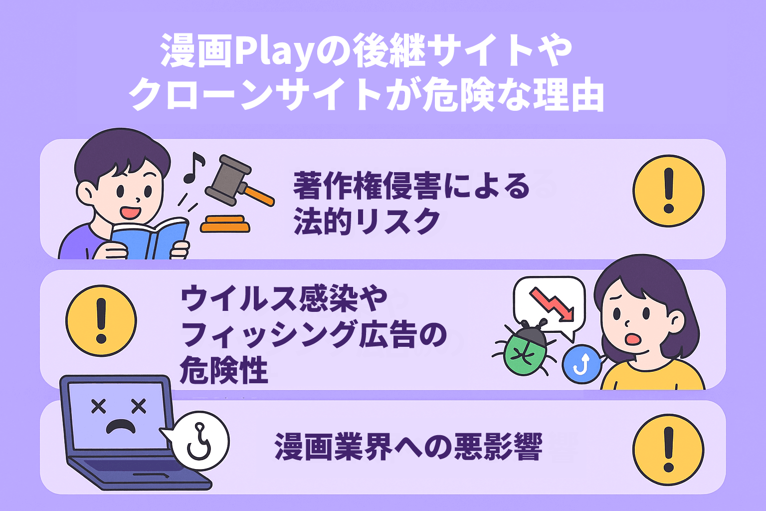 ここでは、漫画Playなどの違法サイトを利用する危険性を解説します。