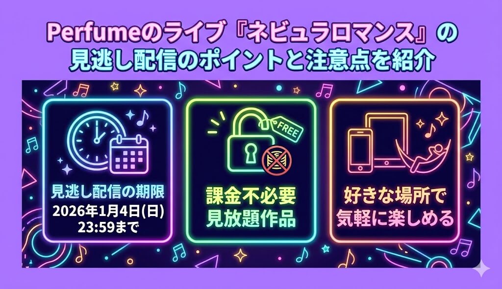 本記事ではそのような方に向けて、Perfumeのライブ『ネビュラロマンス』の配信状況やセトリ、見逃し配信をお得に楽しむ方法について徹底解説します