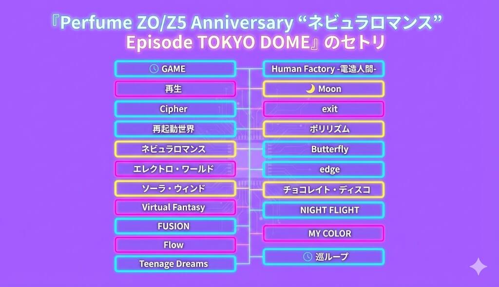 【ネタバレ注意】『Perfume ZO/Z5 Anniversary “ネビュラロマンス” Episode TOKYO DOME』のセトリを紹介
