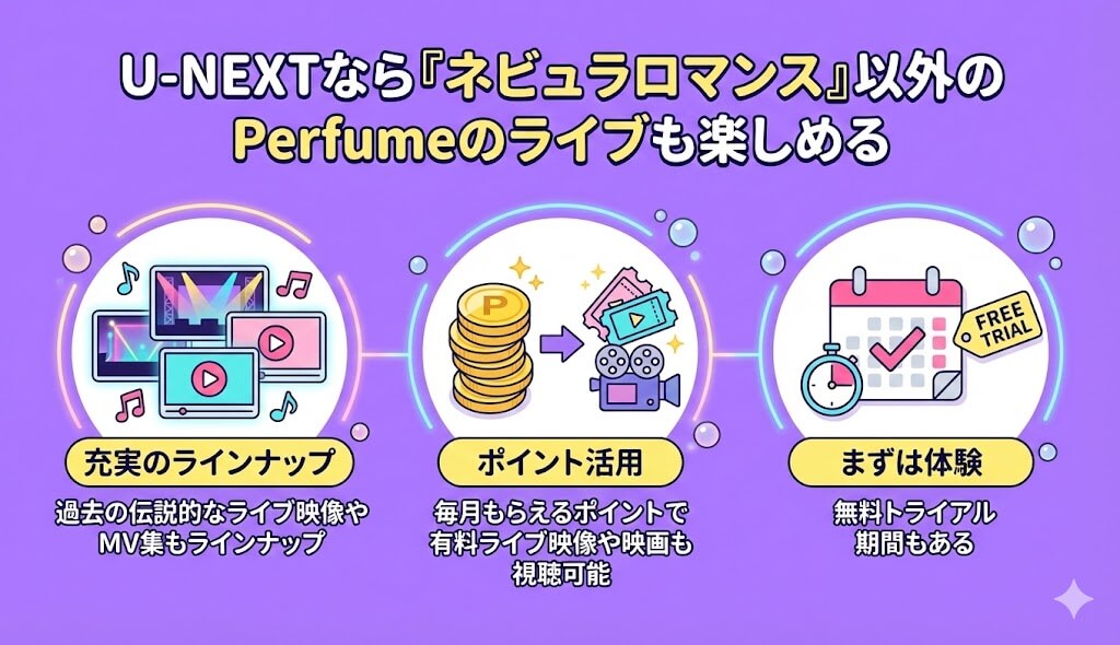 本記事では、Perfumeのライブ『ネビュラロマンス』の配信情報やセトリ、U-NEXTで視聴するメリットについて解説しました。